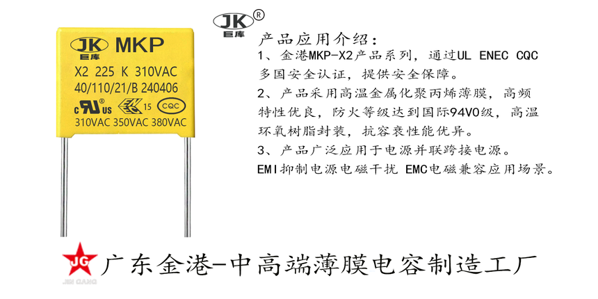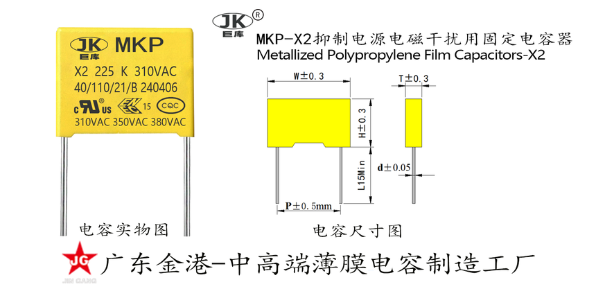 産(chan)品品牌 :JK巨(ju)庫金港JINGANG 産(chǎn)品材質: 金(jīn)屬化聚丙(bǐng)烯高溫薄(báo)膜 産品性(xìng)能: 采用高(gāo)溫金屬化(huà)聚丙烯薄(bao)膜 耐壓高(gāo),損耗低,内(nei)部溫升小(xiao),使用錫合(hé)金噴金, 具(jù)備良好的(de)通電流能(néng)力。 産品作(zuò)用: 廣泛應(yīng)用于各種(zhǒng)交流跨接(jie),抗幹擾電(diàn)路場景。 定(ding)制加工 :可(kě)按客戶需(xu)求定制,滿(man)足客戶不(bu)同需求。