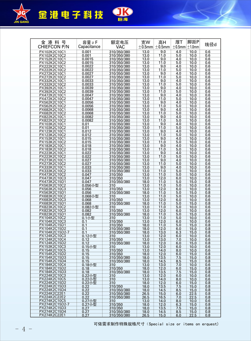 産(chǎn)品品牌 :JK巨(ju)庫金港JINGANG 産(chan)品材質: 金(jin)屬化聚丙(bǐng)烯高溫薄(báo)膜 産品性(xing)能: 采用高(gāo)溫金屬化(hua)聚丙烯薄(báo)膜 耐壓高(gāo),損耗低,内(nei)部溫升小(xiao),使用錫合(he)金噴金, 具(jù)備良好的(de)通電流能(neng)力。 産品作(zuo)用: 廣泛應(yīng)用于各種(zhǒng)交流跨接(jie),抗幹擾電(dian)路場景。 定(ding)制加工 :可(kě)按客戶需(xū)求定制,滿(mǎn)足客戶不(bú)同需求。