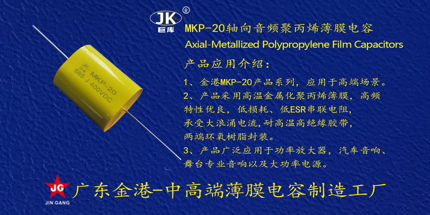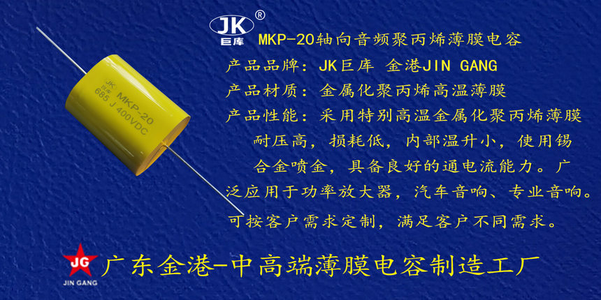 産品(pin)品牌 :JK巨庫金(jīn)港JINGANG 産品材質(zhi): 金屬化聚丙(bing)烯高溫薄膜(mó) 産品性能: 采(cǎi)用高溫金屬(shu)化聚丙烯薄(báo)膜 耐壓高,損(sun)耗低,内部溫(wēn)升小,使用錫(xi)合金噴金, 具(jù)備良好的通(tong)電流能力。 産(chan)品作用: 廣泛(fan)應用于功率(lǜ)放大器,汽車(che)音響、專業音(yīn)響。 定制加工(gōng) :可按客戶需(xū)求定制,滿足(zu)客戶不同需(xū)求。