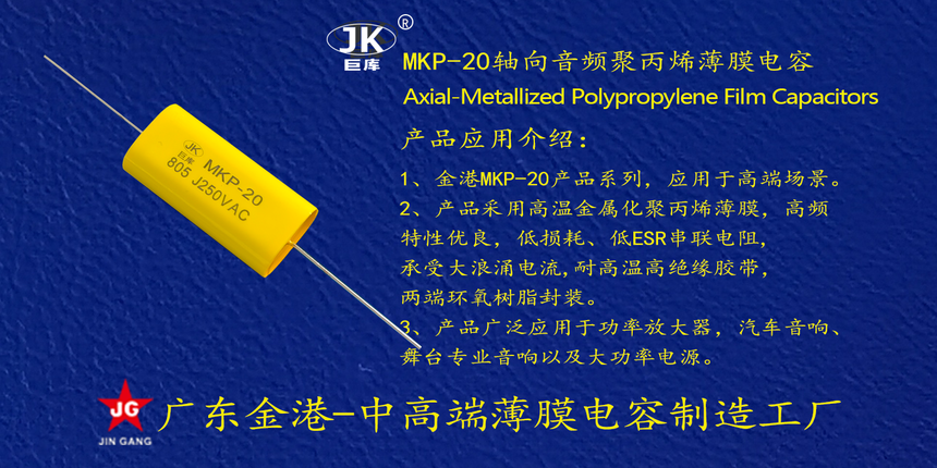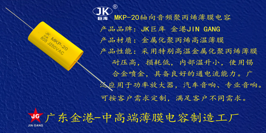 産品(pin)品牌 :JK巨庫金(jīn)港JINGANG 産品材質(zhi): 金屬化聚丙(bing)烯高溫薄膜(mó) 産品性能: 采(cǎi)用高溫金屬(shu)化聚丙烯薄(báo)膜 耐壓高,損(sun)耗低,内部溫(wēn)升小,使用錫(xi)合金噴金, 具(jù)備良好的通(tong)電流能力。 産(chan)品作用: 廣泛(fan)應用于功率(lǜ)放大器,汽車(che)音響、專業音(yīn)響。 定制加工(gōng) :可按客戶需(xū)求定制,滿足(zu)客戶不同需(xū)求。