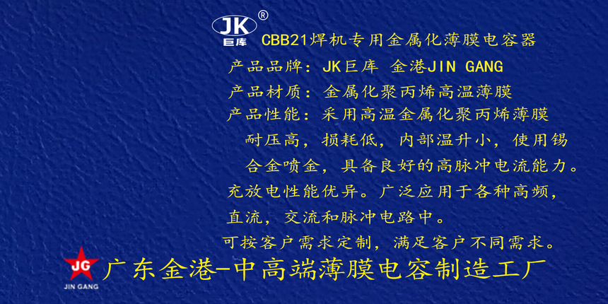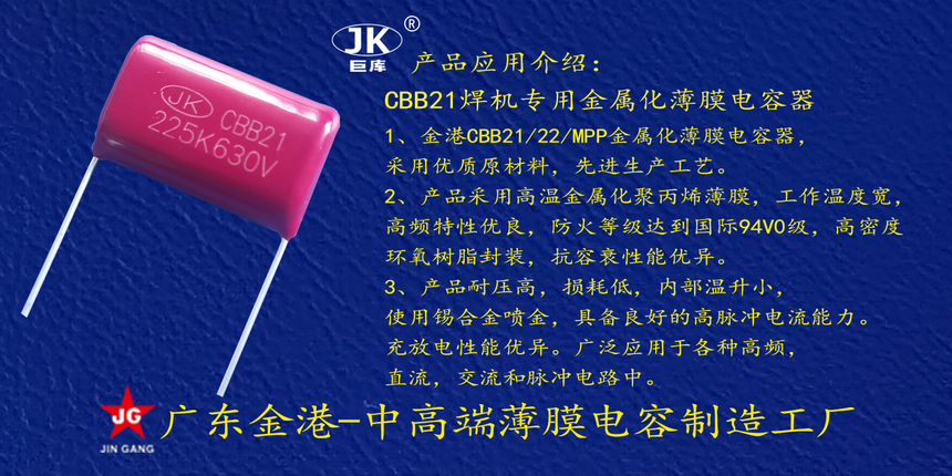 産品品牌(pai) :JK巨庫金港JINGANG 産品材(cai)質: 金屬化聚丙烯(xi)高溫薄膜 産品性(xìng)能: 采用高溫金屬(shǔ)化聚丙烯薄膜 耐(nai)壓高,損耗低,内部(bu)溫升小,使用錫合(he)金噴金, 具備良好(hǎo)的高脈沖電流能(neng)力。 産品作用: 廣泛(fan)應用于各種交流(liu)跨接,抗幹擾電路(lù)場景。 定制加工 :可(ke)按客戶需求定制(zhi),滿足客戶不同需(xū)求。