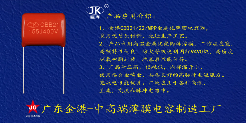 産品(pin)品牌 :JK巨庫(ku)金港JINGANG 産品(pin)材質: 金屬(shu)化聚丙烯(xi)高溫薄膜(mo) 産品性能(neng): 采用高溫(wen)金屬化聚(jù)丙烯薄膜(mó) 耐壓高,損(sun)耗低,内部(bu)溫升小,使(shǐ)用錫合金(jin)噴金, 具備(bei)良好的高(gāo)脈沖電流(liu)能力充放(fang)電性能優(yōu)異。 産品作(zuo)用: 廣泛應(yīng)用于各種(zhǒng)高頻,直流(liú),交流和脈(mò)沖電路中(zhōng)。 定制加工(gong) :可按客戶(hù)需求定制(zhì),滿足客戶(hu)不同需求(qiu)。