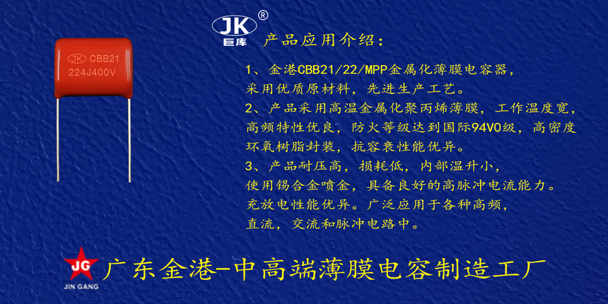 産品品(pǐn)牌 :JK巨庫金港JINGANG 産品(pǐn)材質: 金屬化聚丙(bǐng)烯高溫薄膜 産品(pǐn)性能: 采用高溫金(jin)屬化聚丙烯薄膜(mó) 耐壓高,損耗低,内(nèi)部溫升小,使用錫(xi)合金噴金, 具備良(liang)好的高脈沖電流(liú)能力充放電性能(néng)優異。 産品作用: 廣(guang)泛應用于各種高(gāo)頻,直流,交流和脈(mò)沖電路中。 定制加(jiā)工 :可按客戶需求(qiú)定制,滿足客戶不(bú)同需求。
