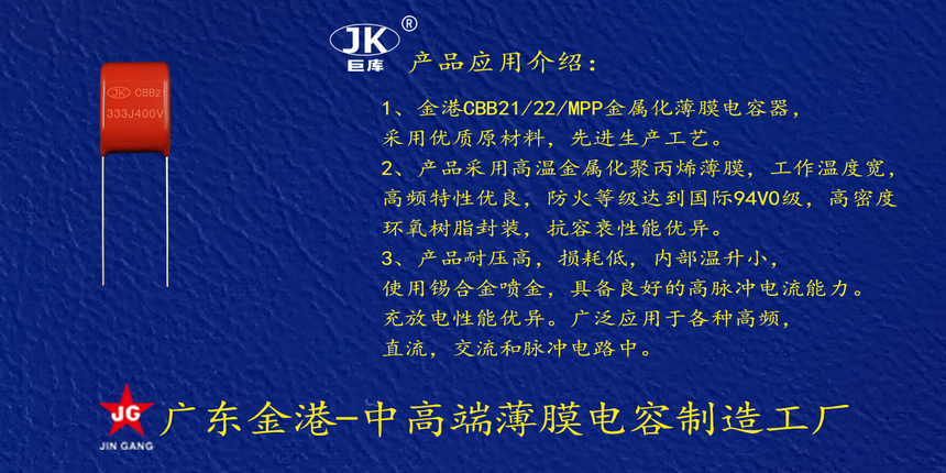 産品品(pin)牌 :JK巨庫金港JINGANG 産品(pǐn)材質: 金屬化聚丙(bing)烯高溫薄膜 産品(pin)性能: 采用高溫金(jīn)屬化聚丙烯薄膜(mo) 耐壓高,損耗低,内(nèi)部溫升小,使用錫(xi)合金噴金, 具備良(liang)好的高脈沖電流(liú)能力充放電性能(néng)優異。 産品作用: 廣(guang)泛應用于各種高(gao)頻,直流,交流和脈(mò)沖電路中。 定制加(jia)工 :可按客戶需求(qiú)定制,滿足客戶不(bú)同需求。