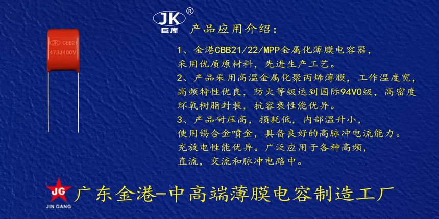 産品(pin)品牌 :JK巨庫(kù)金港JINGANG 産品(pǐn)材質: 金屬(shǔ)化聚丙烯(xī)高溫薄膜(mó) 産品性能(néng): 采用高溫(wen)金屬化聚(jù)丙烯薄膜(mo) 耐壓高,損(sun)耗低,内部(bu)溫升小,使(shǐ)用錫合金(jīn)噴金, 具備(bèi)良好的高(gāo)脈沖電流(liu)能力充放(fàng)電性能優(you)異。 産品作(zuò)用: 廣泛應(yīng)用于各種(zhǒng)高頻,直流(liú),交流和脈(mò)沖電路中(zhōng)。 定制加工(gōng) :可按客戶(hù)需求定制(zhì),滿足客戶(hu)不同需求(qiú)。
