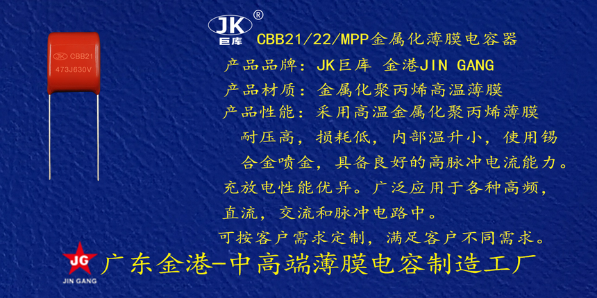 産(chǎn)品品牌(pai) :JK巨庫金(jīn)港JINGANG 産品(pin)材質: 金(jin)屬化聚(jù)丙烯高(gao)溫薄膜(mo) 産品性(xìng)能: 采用(yòng)高溫金(jīn)屬化聚(jù)丙烯薄(báo)膜 耐壓(ya)高,損耗(hao)低,内部(bù)溫升小(xiǎo),使用錫(xī)合金噴(pen)金, 具備(bei)良好的(de)高脈沖(chòng)電流能(neng)力充放(fàng)電性能(neng)優異。 産(chǎn)品作用(yòng): 廣泛應(ying)用于各(gè)種高頻(pin),直流,交(jiāo)流和脈(mo)沖電路(lù)中。 定制(zhi)加工 :可(kě)按客戶(hu)需求定(ding)制,滿足(zu)客戶不(bú)同需求(qiú)。