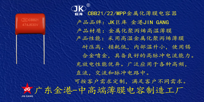 産品品(pin)牌 :JK巨庫金港(gang)JINGANG 産品材質: 金(jin)屬化聚丙烯(xī)高溫薄膜 産(chǎn)品性能: 采用(yòng)高溫金屬化(hua)聚丙烯薄膜(mo) 耐壓高,損耗(hao)低,内部溫升(shēng)小,使用錫合(he)金噴金, 具備(bèi)良好的高脈(mò)沖電流能力(li)充放電性能(neng)優異。 産品作(zuò)用: 廣泛應用(yòng)于各種高頻(pín),直流,交流和(hé)脈沖電路中(zhōng)。 定制加工 :可(ke)按客戶需求(qiu)定制,滿足客(ke)戶不同需求(qiú)。