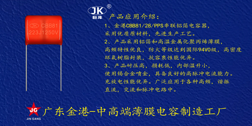 産(chan)品品牌 :JK巨庫金港(gǎng)JINGANG 産品材質: 金屬化(huà)聚丙烯高溫薄膜(mo) 産品性能: 采用高(gāo)溫金屬化聚丙烯(xi)薄膜 耐壓高,損耗(hao)低,内部溫升小,使(shǐ)用錫合金噴金, 具(jù)備良好的高脈沖(chòng)電流能力,充放電(dian)性能優異。 産品作(zuo)用: 廣泛應用于各(gè)種高頻諧振,直流(liu),交流和脈沖電路(lù)中。 定制加工 :可按(an)客戶需求定制,滿(mǎn)足客戶不同需求(qiu)。