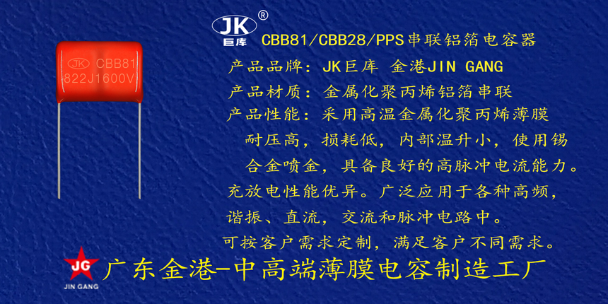 産(chan)品品牌 :JK巨庫(kù)金港JINGANG 産品材(cái)質: 金屬化聚(ju)丙烯高溫薄(báo)膜 産品性能(neng): 采用高溫金(jin)屬化聚丙烯(xī)薄膜 耐壓高(gāo),損耗低,内部(bù)溫升小,使用(yòng)錫合金噴金(jin), 具備良好的(de)高脈沖電流(liú)能力,充放電(dian)性能優異。 産(chan)品作用: 廣泛(fan)應用于各種(zhong)高頻諧振,直(zhí)流,交流和脈(mò)沖電路⭐中。 定(dìng)制加工 :可按(an)客戶需求定(dìng)制,滿足客戶(hu)不同需求。