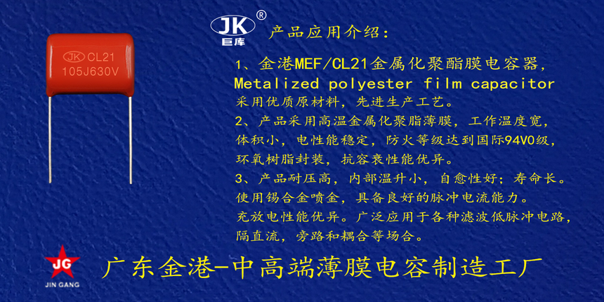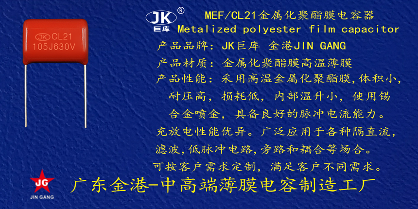 産品品(pin)牌 :JK巨庫金(jīn)港JINGANG 産品材(cái)質: 金屬化(huà)聚丙烯高(gao)溫薄膜 産(chǎn)品性能: 采(cǎi)用高溫金(jin)屬化聚丙(bǐng)烯薄膜 耐(nai)壓高,損耗(hao)低,内部溫(wēn)升小,使用(yòng)錫合金噴(pēn)金, 具備良(liáng)好的高脈(mò)沖電流能(néng)力,充放電(diàn)性能優異(yi)。 産品作用(yong): 廣泛應用(yòng)于各種隔(gé)直流濾波(bo),低脈沖電(dian)路,旁路和(he)耦☁️合等場(chang)合。 定制加(jiā)工 :可按客(ke)戶需求定(dìng)制,滿足客(ke)戶不同需(xu)求。