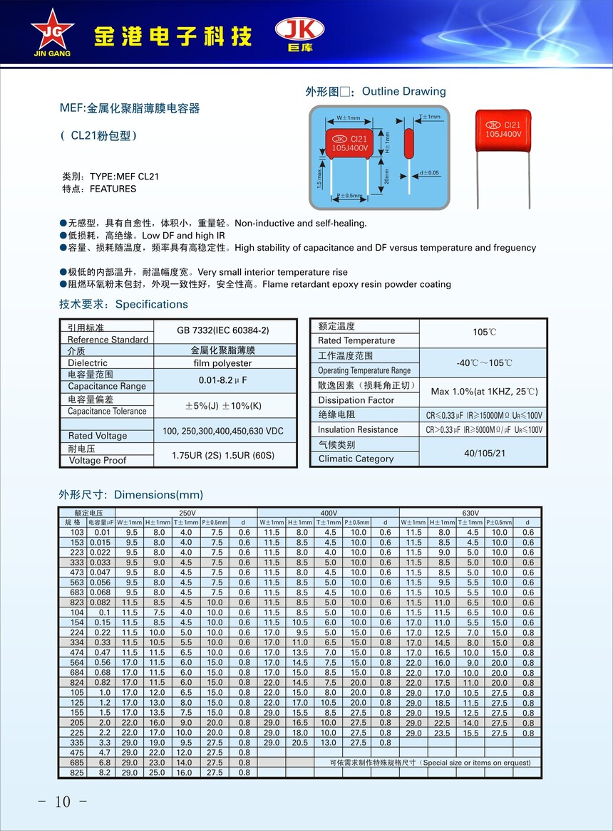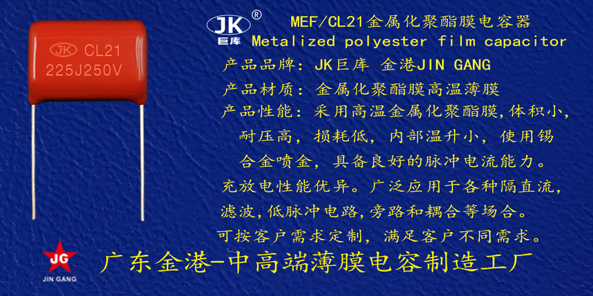 産品品牌(pái) :JK巨庫金港JINGANG 産品材(cái)質: 金屬化聚丙烯(xī)高溫薄膜 産品性(xing)能: 采用高溫金屬(shǔ)化聚丙烯薄膜 耐(nai)壓高,損耗低,内部(bù)溫升小,使用錫合(hé)金噴金, 具備良好(hǎo)的高脈沖電流能(néng)力,充放電性能優(yōu)異。 産品作用: 廣泛(fan)應用于各種隔直(zhí)流濾波,低脈沖電(diàn)路,旁路和耦合等(děng)場合。 定制加工 :可(kě)按客戶需求定制(zhì),滿足客戶不同需(xū)求。