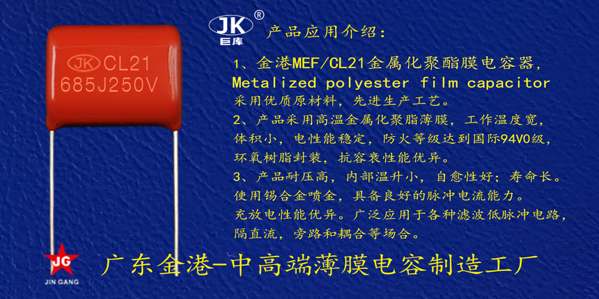 産品品牌(pái) :JK巨庫金港JINGANG 産(chan)品材質: 金屬(shu)化聚丙烯高(gāo)溫薄膜 産品(pin)性能: 采用高(gāo)溫金屬化聚(ju)丙烯薄膜 耐(nài)壓高,損耗低(dī),内部溫升小(xiao),使用錫合金(jīn)噴金, 具備良(liáng)好的高脈沖(chòng)電流能力,充(chōng)放電性能優(yōu)異。 産品作用(yong): 廣泛應用于(yú)各種隔直流(liu)濾波,低脈沖(chong)電路,旁路和(hé)耦🌍合等場🤟合(hé)。 定制加工 :可(ke)按客戶需求(qiú)定制,滿足客(kè)戶不同需求(qiu)。
