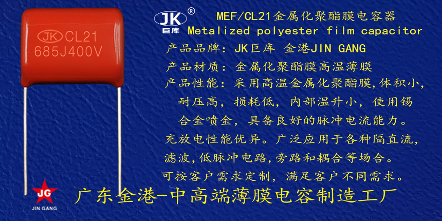 産品品牌(pái) :JK巨庫金港JINGANG 産(chan)品材質: 金屬(shu)化聚丙烯高(gāo)溫薄膜 産品(pin)性能: 采用高(gāo)溫金屬化聚(ju)丙烯薄膜 耐(nài)壓高,損耗低(dī),内部溫升小(xiao),使用錫合金(jīn)噴金, 具備良(liáng)好的高脈沖(chòng)電流能力,充(chōng)放電性能優(yōu)異。 産品作用(yong): 廣泛應用于(yú)各種隔直流(liu)濾波,低脈沖(chong)電路,旁路和(hé)耦合等場合(hé)。 定制加工 :可(ke)按客戶需求(qiú)定制,滿足客(kè)戶不同需求(qiu)。