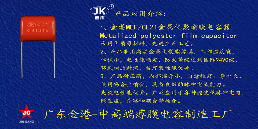 産品(pin)品牌 :JK巨(jù)庫金港(gang)JINGANG 産品材(cai)質: 金屬(shu)化聚丙(bing)烯高溫(wēn)薄膜 産(chan)品性能(néng): 采用高(gāo)溫金屬(shǔ)化聚丙(bing)烯薄膜(mó) 耐壓高(gāo),損耗低(dī),内部溫(wēn)升小,使(shi)用錫合(hé)金噴金(jin), 具備良(liang)好的高(gāo)脈沖電(diàn)流能力(lì),充放電(dian)性能優(you)異。 産品(pin)作用: 廣(guang)泛應用(yong)于各種(zhǒng)隔直流(liú)濾波,低(dī)脈沖電(dian)路,旁路(lu)和耦合(hé)等場合(he)。 定制加(jiā)工 :可按(an)客戶需(xu)求定制(zhì),滿足客(ke)戶不同(tóng)需求。