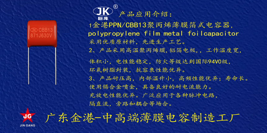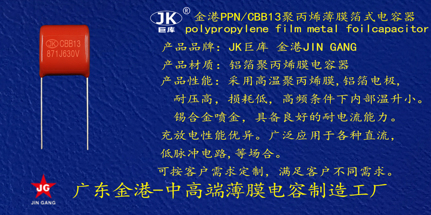 産品(pin)品牌 :JK巨庫金港(gang)JINGANG 産品材質: 鋁箔(bó)聚丙烯膜電容(róng)器 産品性能: 采(cǎi)用高溫聚丙烯(xī)膜,鋁箔電極耐(nai)壓高, 損耗低,i高(gāo)頻條件下内部(bu)溫升小錫合金(jin)噴金, 具備良好(hǎo)的耐電流能力(lì)。充放電性能優(you)異。 産品作用: 廣(guang)泛應用于各種(zhong)直流,低脈沖電(diàn)路,等場合。 定制(zhì)加工 :可按客戶(hu)需求定制,滿足(zú)客戶不同需求(qiú)。