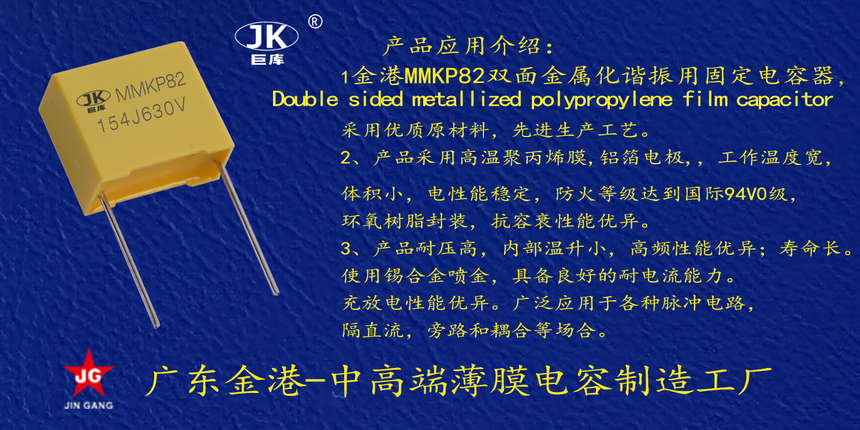 産(chǎn)品品牌 :JK巨(jù)庫金港JINGANG 産(chǎn)品材質: 雙(shuang)面金屬化(huà)聚丙烯,塑(su)料外殼封(fēng)裝 産品性(xing)能: 采用高(gāo)溫雙面化(hua)聚丙烯,耐(nài)壓高, 損耗(hào)低,高頻條(tiao)件下内部(bù)溫升小。錫(xi)合金噴金(jin), 具備良好(hao)的耐電流(liú)能力。充放(fang)電性能優(you)異。 産品作(zuo)用: 應用于(yú)高壓高頻(pín)脈沖電路(lù),諧振電路(lù),等場合。