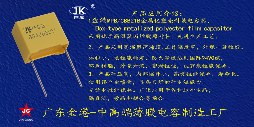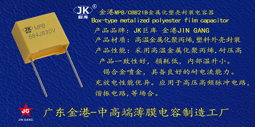 産品品(pǐn)牌 :JK巨庫金港JINGANG 産品(pin)材質: 高溫金屬化(huà)聚丙烯,塑料外殼(ke)封裝 産品性能: 采(cai)用高溫金屬化聚(jù)丙烯,耐壓高産品(pin)一緻性好, 損耗低(dī),内部溫升小。錫合(hé)金噴金, 具備良好(hǎo)的耐電流能力。充(chōng)放電性能優異。 産(chǎn)品作用: 應用于高(gāo)壓高頻脈沖電路(lù),諧振電路,等場合(hé)。