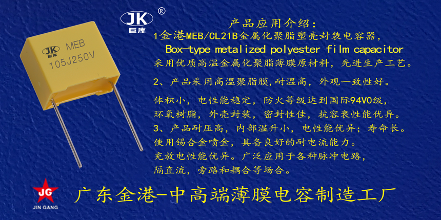 産品品牌(pái) :JK巨庫金港JINGANG 産品(pǐn)材質: 高溫金屬(shu)化聚脂薄膜,塑(su)料外殼封裝 産(chǎn)品性能: 采用高(gāo)溫金屬化聚脂(zhī)薄膜,耐壓高