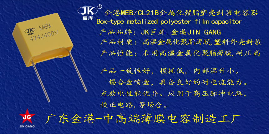 産品品牌(pai) :JK巨庫金港JINGANG 産品(pǐn)材質: 高溫金屬(shǔ)化聚脂薄膜,塑(su)料外殼封裝 産(chǎn)品性能: 采用高(gao)溫金屬化聚脂(zhī)薄膜,耐壓高